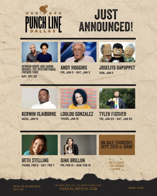 The text club presale goes live Tuesday, September 23 at 10 am, and general on sale begins Thursday, September 25 at 10 am. Get your tickets at punchlinedfw.com.