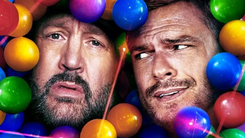 The poster features a close-up of Kevin James and Alan Ritchson‘s faces, surrounded by plastic balls similar to those found in a children’s ball pit, and with what seems to be multiple targeting lasers pointed at them.