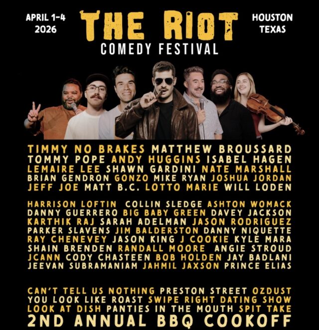 The Riot Comedy Festival — Houston’s premier celebration of stand-up, podcasts, improv, BBQ, and unforgettable live comedy — returns for its fourth annual edition, April 1–4, 2026, featuring breakout star Timmy No Breaks and an electrifying lineup of national and local comedic talent. Shows take place in the heart of Houston’s famed Montrose neighborhood at The Riot Comedy Club and The Gordy Theatre (Stages).